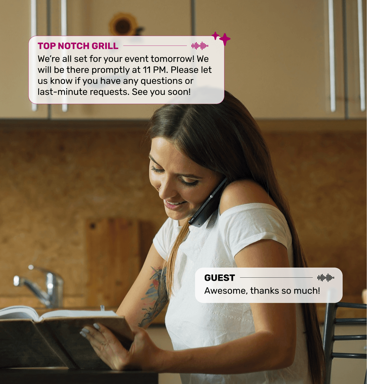 Provides final confirmations, timing updates, and customer communication automatically during event preparation and delivery.